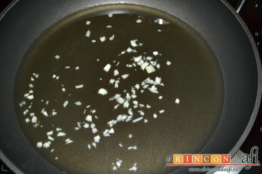 • Mientras tanto doramos ligeramente dos dientes de ajo picados en una sartén con un buen chorro de aceite de oliva.