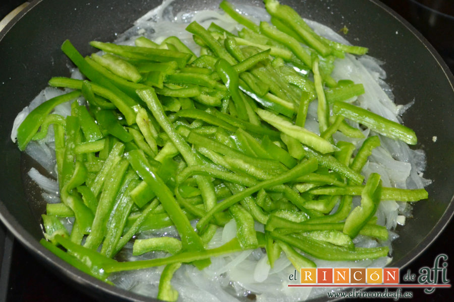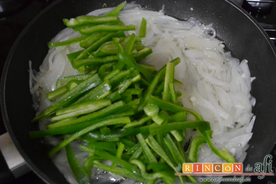 • Seguido añadimos la cebolla cortada en juliana con una pizca de sal gorda, dejando que vaya pochando lentamente.
