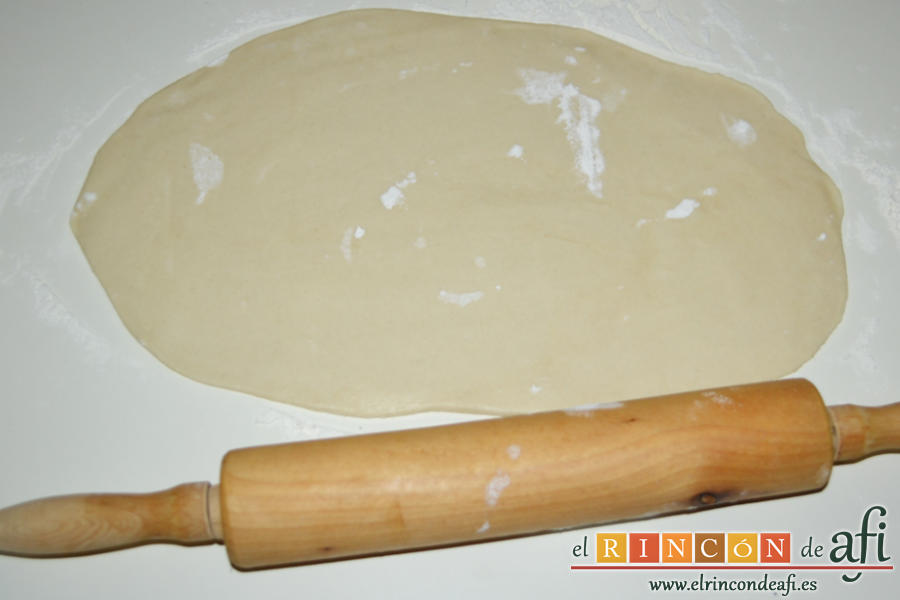 - Pasados los diez minutos de reposo de la masa la ponemos en una tabla enharinada y la estiramos con rodillo dándole forma elíptica intentando que quede lo más fina posible.