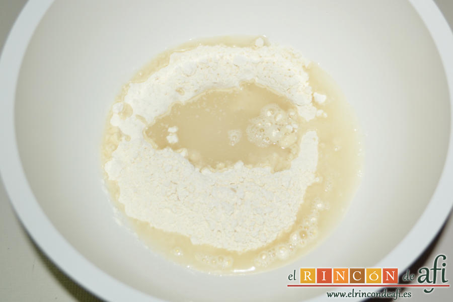 - Empezamos preparando la masa y, para ello, ponemos en un bol la harina de trigo de todo uso añadiéndole la sal y el agua, mezclándolos hasta integrar.