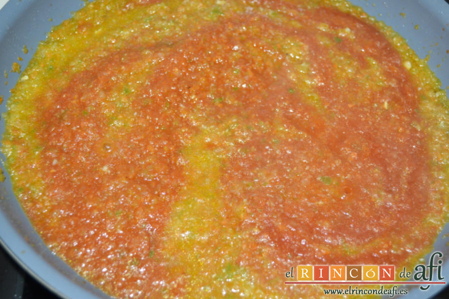 • Seguido vertemos el vino blanco dejando que evapore el alcohol para después añadir el tomate triturado.