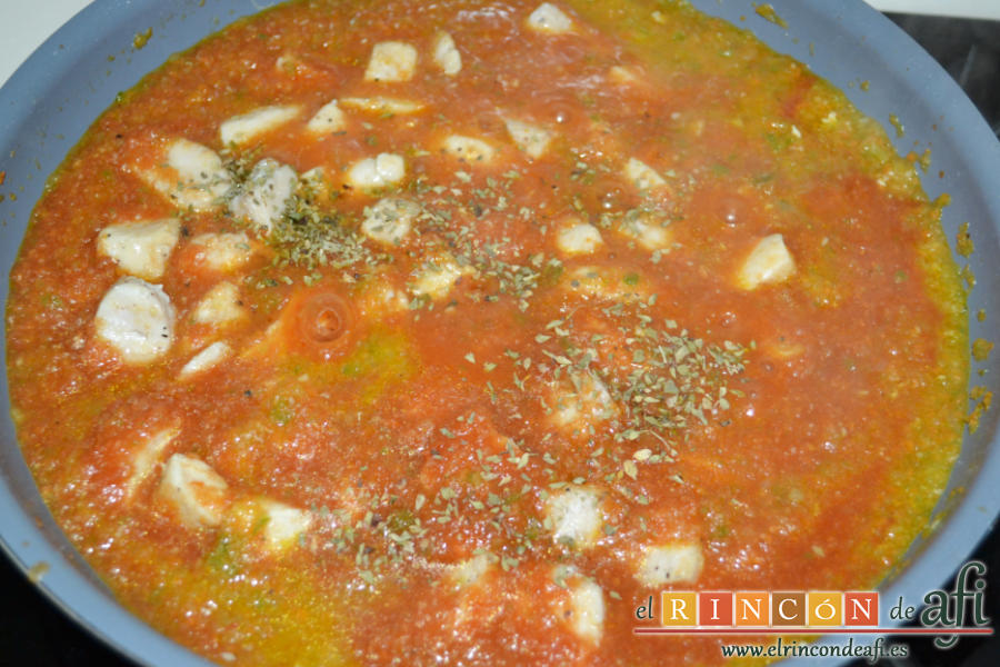 • Removemos bien para luego reintegrar los solomillos de pollo que habíamos reservado agregando una cucharadita de orégano seco.